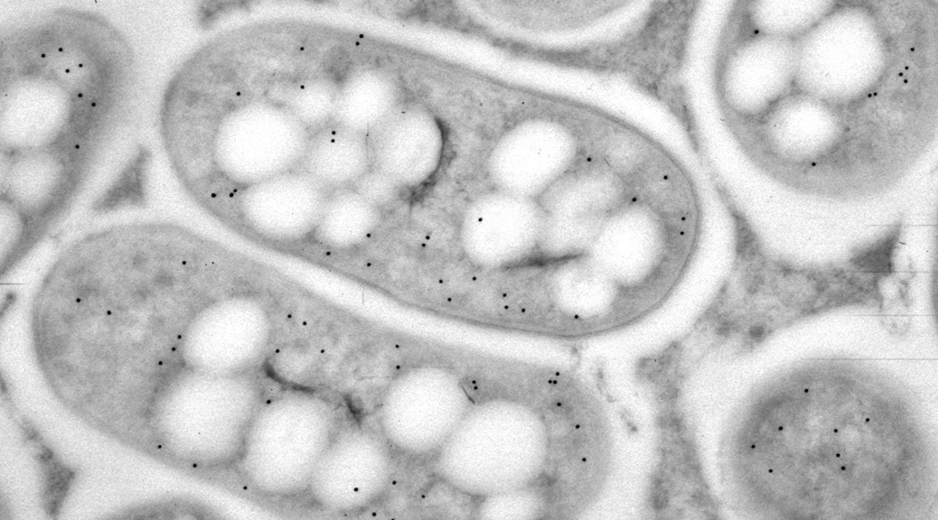 Photo credits: Feature: Burkholderia in nodules showing polyhyroxybutyrate (PHB) granules (white blobs) and immunogold-labelled NifH (black spots). Euan James, James Hutton Institute.